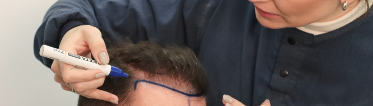 Médica realizando implante capilar.